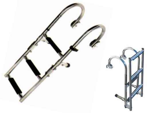Escalera para Neumática en Inox. Los peldaños son de madera. Abatible y plegable para ocupar poco espacio a la hora de estiarla. Pasamanos largo.